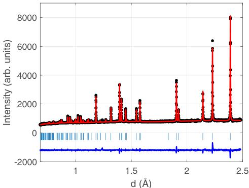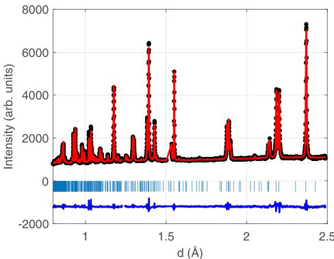 FIG. 6. Data and refinement using Pnam for data collected on HRPD at 20 K as a function of d spacing. Black circles indicate the measured data, the red line the refinement, and the blue line indicates the difference between the two (offset by -2000 units). Vertical ticks indicate the positions of Bragg reflections.