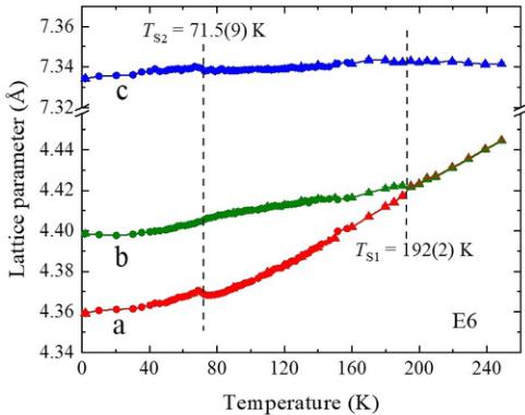 On cooling, a phase transition is observed at \( T_{S1} = 192(2) \) K that appears to be tetragonal to orthorhombic, as illustrated in Fig. 2, which shows the lattice parameter as a function of temperature determined from Rietveld refinements using the tetragonal 14/mmm space group above the transition and the orthorhombic Immm space group below it, from data collected on E6. The latter space group represents the symmetry of the lattice if only macroscopic strain is taken