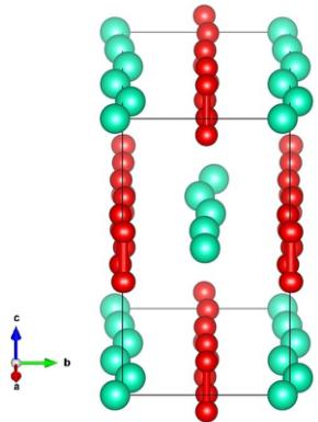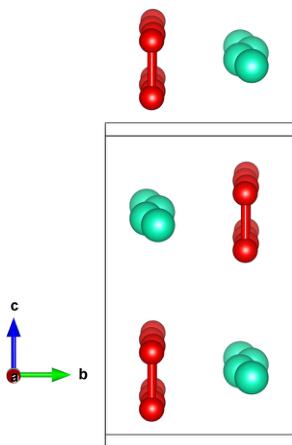 FIG. 7. The refined crystal structure with the Pnam space group, with oxygen molecules shown in red (spheres connected by a cylinder to indicate the molecular bond) and cesium ions shown in green (spheres only). The unit cell is indicated by the gray box. The view shown is slightly tilted from being parallel to the a axis. The periodic displacements of the Cs ions are clear, with a smaller but still visible periodic displacement of the \( O_{2}^{-} \) molecules also. The figure shows two unit cells along the a axis.