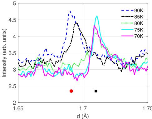 FIG. 5. Data from WISH showing the transition from incommensurate to commensurate crystal structure. Below \( \sim80 \) K, a peak corresponding to \( \mathbf{Q}_{\mathrm{C}} = (\frac{3}{2}, 2, 1) \) appears at d = 1.71 Å. At higher temperatures, a peak corresponding to \( \mathbf{Q}_{\mathrm{IC}} = (1.57, 2, 1) \) at d = 1.69 Å is visible. Commensurate and incommensurate peak positions are indicated by a black square and a red circle, respectively.