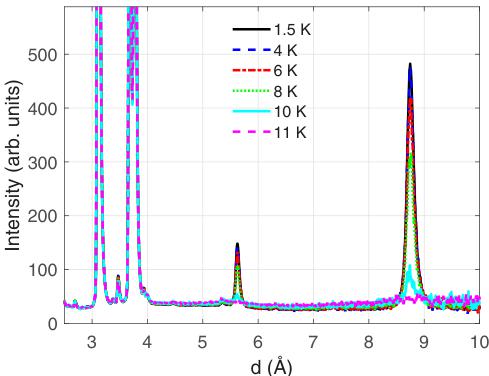 FIG. 8. Overview of the data collected in the low angle bank on WISH as a function of temperature between 1.5 K and 11 K. Data have been converted from time of flight to d spacing. The strong peaks at \( \sim \) 8.8 Å and \( \sim \) 5.7 Å correspond to the (1,0,0) and (1,0,1) Bragg reflections, respectively.