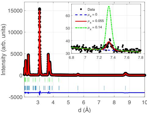 Close examination of the data collected on WISH shows that at temperatures above \( \sim72 \) K, and at least up to 180 K, weak incommensurate superlattice reflections are visible above the background that can be indexed using a propagation vector of \( \mathbf{k}_{\mathrm{IC}} = (0.561(2), 0, 0) \) referenced to the tetragonal unit cell, i.e., a period of 1.78 lattice units. The intensity of the strongest incommensurate peaks is about 1% of the strongest commensurate nuclear Bragg peak visible in Figs. 1 and 6 at \( d = 2.37 \) Å. The incommensurate peaks were just detectable above the background in the HRPD data in an 8 h