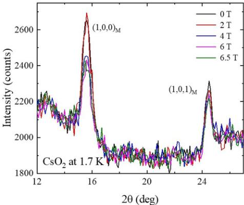 Neutron diffraction measurements from the 1960s confirmed that \( KO_{2} \) orders antiferromagnetically [17], however, in the data collected at that time only two magnetic Bragg peaks could be discerned above background, making a magnetic structure refinement impossible. On the other hand, the precise details of the crystal and magnetic structures of \( RbO_{2} \) and \( CsO_{2} \) were much less well characterized at that time [15,20]. What was known is that, like \( KO_{2} \) , both materials take on a tetragonal structure at room temperature, with transitions at \( \sim150 \) K into possible orthorhombic structures. Around the same temperature, an incommensurate structure was observed in both materials, with a period around three lattice units along the a axis. Neither the orthorhombic structure nor the incommensurate structure were solved in detail in either case, however.