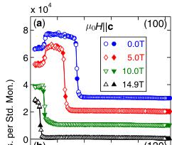 Neutron diffraction directly identifies the nature of the magnetic order in the different phases. The \( \mu_{0}H \) and T dependence of the neutron Bragg intensity at the (100) and (120) positions, shown in Figs. 2(a) and 2(b), reveals commensurate (C) magnetic order with \( Q_{c} = (0, 0, 0) \) in all three magnetic phases, separated by first-order
