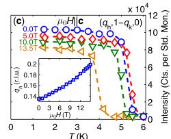 - Incommensurate (IC) order (in LT phase): \( \mathbf{Q}_{\mathrm{ic}} = (q_h, q_k, 0) \). In zero field, \( q_h = 0.136(2) \) and \( q_k = 0.211(2) \). \( q_h \) increases monotonically with \( \mu_0H \), while \( q_k \) remains \( \mu_0H \)-independent.