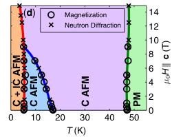 - Medium-T (MT) phase ( \( T_{N3} < T < T_{N2} \) ): Commensurate (C) magnetic order, described by irreducible representation \( \Gamma_{c}^{1} \). Does not allow for FM magnetization.