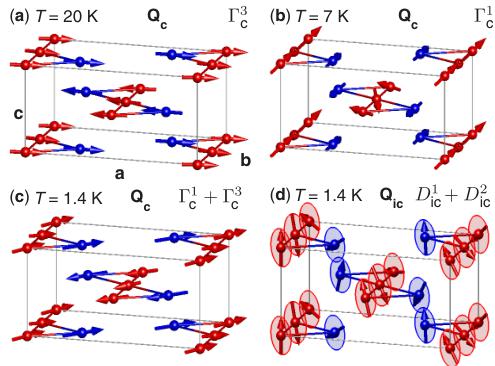 FIG. 3 (color online). The refined zero field magnetic structures of \( Mn_{2}GeO_{4} \) . In (a)–(c) we show the refined commensurate structures at \( T = 20 \, K \) , (b) \( T = 7 \, K \) and (c) \( T = 1.4 \, K \) . In (d) we show the refined incommensurate magnetic structure at \( T = 1.4 \, K \) . In (d) the envelopes around the moments indicate the rotation plane of each ion.