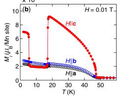 The low temperature (T) bulk properties of \( Mn_{2}GeO_{4} \) are summarized by the measurements shown in Figs. 1(b)–1(d). The T dependence of the magnetization shows that long-range magnetic order sets in at \( T_{N1} = 47 \) K and that there are additional first-order transitions in the magnetic properties at both \( T_{N2} = 17 \) K and \( T_{N3} = 5.5 \) K. We label the phases as high-T (HT), medium-T (MT), and low-T (LT) phases. These transitions are most clearly seen in the T dependence of the FM moment that points along the crystal c axis. Measurements of the relative dielectric constant along all crystal directions [Fig. 1(c)] show features that are clearly correlated with the magnetic transitions. The most pronounced anomalies are observed on cooling through \( T_{N3} \) , with the largest response observed for \( \epsilon_{c} \) ( \( E \parallel c \) ). These data indicate the transition at \( T_{N3} \) to separate ferroelectric (FE) and paraelectric phases. Pyroelectric measurements [Fig. 1(d)] directly confirm the emergence of a macroscopic FE polarization P parallel to the crystal c axis for \( T < T_{N3} \) . These data demonstrate that \( Mn_{2}GeO_{4} \) features a ferromagnetic and ferroelectric phase.