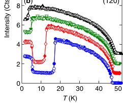 Neutron diffraction directly identifies the nature of the magnetic order in the different phases. The \( \mu_{0}H \) and T dependence of the neutron Bragg intensity at the (100) and (120) positions, shown in Figs. 2(a) and 2(b), reveals commensurate (C) magnetic order with \( Q_{c} = (0, 0, 0) \) in all three magnetic phases, separated by first-order