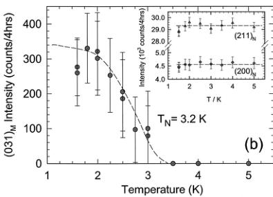 - Magnetic ordering type and temperature: Antiferromagnetic long-range order (AF LRO) below \( T_{N}=3.2 \) K.