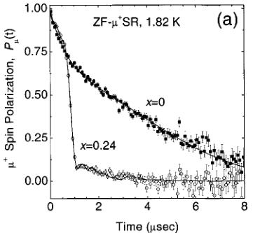 - Muon precession frequencies: \( 0.5<\nu_{\mu}<3 \) MHz, corresponding to internal fields \( H_{int} \sim 36 - 192 \) G.