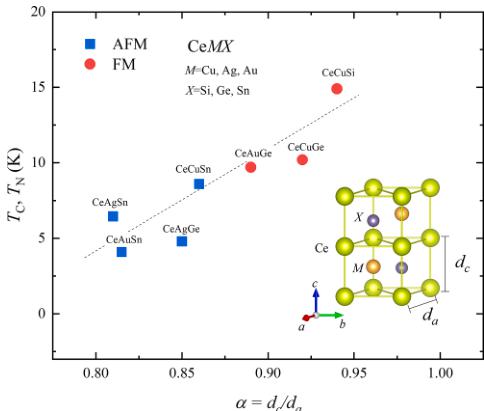 Fig. 1. Magnetic ordering temperatures \( T_{C} \) , \( T_{N} \) of CeMX (M = Cu, Ag, Au, and X = Si, Ge, Sn) as a function of anisotropic parameter \( \alpha = d_{c}/d_{a} \) , where \( d_{a} \) and \( d_{c} \) represent Ce-Ce bond length along the crystallographic a- and c-axis, respectively. A dashed line is a guide to the eye. The schematic drawing represents a hexagonal crystal structure of CeMX.