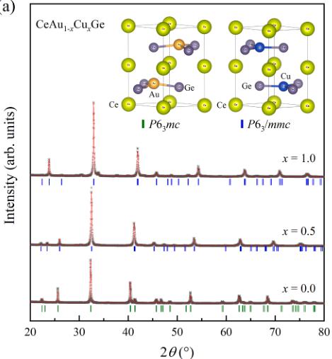 Fig. 2(a) shows crystal structures of CeAuGe and CeCuGe and representative PXRD patterns for \( CeAu_{1-x}Cu_xGe \) (x = 0.0, 0.5, 1.0). Both end-member compounds adopt hexagonal structure, wherein the two different hexagonal layers of Ce – Ce and M – Ge (M = Cu and Au) stack alternately along the crystallographic c-axis. While the puckered