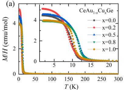 An unusual non-collinear FM structure has been reported in CeAlSi, presumably due to the non-centrosymmetric crystal structure [20]. In our case, both non-centrosymmetric end member CeAuGe and the centrosymmetric one CeCuGe exhibit ferromagnetism with transition temperature near 10 K. This is in accordance with a previous neutron powder diffraction study that has shown that the magnetic ordering in CeAuGe is a collinear FM, and we note that the magnetic structure of CeCuGe has not been reported [21]. Cu-doping of the non-