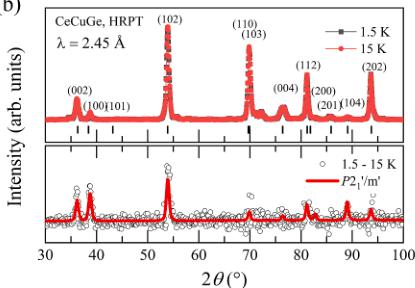 allowed by symmetry. Assuming that the only one irrep is active at the magnetic transition, eight possible magnetic Shubnikov subgroups (labeled as 1, 2, 4–7, 12, and 13 in Fig. S3(a)) are allowed, and four of them (labeled as 1, 2, 5, and 7) have maximal symmetry. For \(P6_{3}/mmc\) (\(0.5 < x < 1.0\)) with \(\mathbf{k} = 0\), four irreps and eight possible magnetic subgroups (labelled as 1, 2, 4–7, 12, and 13 in \(\mathrm{Fig.~S3(b)}\)) are allowed and four of them (labelled as 1, 2, 5, and 7) have maximal symmetry. All Shubnikov magnetic space groups (MSG) were sorted to fit the difference patterns, starting from maximal symmetry subgroups. The best fit results were obtained in the orthorhombic \(\mathrm{Cmc}^{\prime}2_{1}^{\prime}\) (no. 36.175, labeled as 5 in \(\mathrm{Fig.~S3(a)}\)) and monoclinic \(P2_{1}^{\prime}/m^{\prime}\) (no. 11.54, labeled as 12 in \(\mathrm{Fig.~S3(b)}\)) MSG for \(\mathrm{CeAuGe}\) and \(\mathrm{CeCuGe}\) with the goodness of fit \(\chi^{2} \sim 1\) (see the details in \(\mathrm{Fig.~S4}\) of SM). The unit cell metrics and atomic coordinates in the fits with the magnetic space groups were fixed by the values refined from the patterns in paramagnetic state at 15 K. We note that the goodness of fit \(\chi^{2}\) is the same as for the Le Bail fit, implying that there is no room for further improvement because Le Bail fit is model-independent.