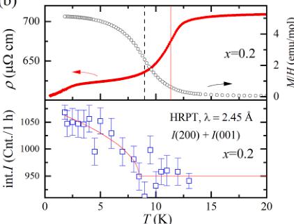Fig. 5(a) shows the zero-field electrical resistivity as a function of temperature \( (\rho(T)) \) of \( CeAu_{1-x}Cu_{x}Ge \) with showing high resistivity values and metallic behaviour, which are consistent with the previous report [30]. The residual-resistance ratio (RRR) coefficients of \( CeAu_{1-x}Cu_{x}Ge \) are of range from 1.2 to 10.6 (details are given in Table S4 in SM). The first-principles calculations show that \( CeAuGe \) and \( CeCuGe \) both are classified to the semimetal [31]. As shown in the top panel, \( CeAuGe \) (x = 0) exhibits a kink (red downward arrow) which is consistent with the \( T_{C} \) determined by a dip of \( \partial M/\partial T \) . Except for x = 0.2, \( \rho(T) \) in every panel shows the apparent kink at \( T_{C} \) . At temperatures above \( T_{C} \) , a local minimum ( \( T_{K^{*}} \) ) in \( \rho(T) \) is observed in x = 0.8 and 1.0 due to the Kondo effects, suggesting that the Kondo hybridization between \( 4f^{1} \) and conduction electrons becomes stronger near x ~ 1. The local minimum in \( \rho(T) \) is better visually seen in the plot in the overall temperature range, as shown in Fig. S5. Upper panel of Fig. 5(b) shows \( \rho(T) \) and \( M(H) \) of x = 0.2 plotted as a function of temperature on the left and right ordinate, respectively. The transition temperatures of \( \rho(T) \) and \( M(H) \) were determined by the peak of \( \partial M/\partial T \) (black dashed line) and \( \partial \rho/\partial T \) (solid red line) for x = 0.2 and separated by \( \sim 2 \) K due to the broadened FM phase transition. In addition, the resistivity \( \rho(T) \) exhibits a broad hump in the ferromagnetic state around 2.5 K. The lower panel of Fig. 5(b) shows neutron integrated intensity (int. I) for x = 0.2 as a function of temperature obtained from the Gaussian fits of two most intense magnetic peaks (200) and (001). The FM contribution appears below 8 K, consistent with the magnetization \( \partial M/\partial T \) . As shown in Fig. 5(c), on the other hand, resistivity exhibits a drop near 12.5 K then moderately decreases from \( \sim 8 \) K, where the bulk \( T_{C} \) is observed. With further lowering the temperature, the transition-like broad hump is observed below 2.5 K, and it decreases down to 0.28 K. When subjected to the magnetic field applied along the out-of-plane direction, the onset temperature of the resistivity drop at 12.5 K is increased and broadened as the field increases, while the transition-like feature around 2.5 K stays robust up to 50 kOe.