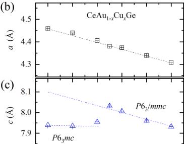 hexagonal layer of Au – Ge breaks the centrosymmetric symmetry \( (P6_{3}mc \) , no. 186), the flat Cu – Ge layer conserves the centrosymmetric symmetry \( (P6_{3}/mmc \) , no. 194) of the hexagonal structure [12,27]. Fig. 2(b) and (c) show lattice parameters of \( CeAu_{1-x}Cu_{x}Ge \) determined from so-called Le Bail fits of the x-ray diffraction patterns using the \( P6_{3}mc \) and \( P6_{3}/mmc \) space groups for \( 0 \leq x \leq 0.5 \) and \( 0.5 < x < 1.0 \) compounds, respectively. In the Le Bail fit, only the crystal metrics and resolution parameters are refined, whereas the integrated Bragg peak intensities are refined independently without any structure model. The crystal structures were determined from the neutron diffraction data (see below). Cu-doping (x) linearly shortens the a-lattice parameter as x increases, decreasing about 3 % at x = 1. On the other hand, the c-lattice parameter exhibits two different linear regimes with an abrupt change near x = 0.5, which can be interpreted by the different crystal symmetry. The unit cell volume linearly decreases as x increases because the a-lattice parameter change is dominant.