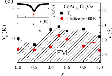 θ: Curie-Weiss temperature), the deduced effective magnetic moment ( \( \mu_{eff} \) ) is plotted as a function of x in the inset of Fig. 3(b). All \( \mu_{eff} \) values are close to 2.54 \( \mu_{B} \) , which is the expected value for J = 5/2 of \( Ce^{3+} \) . The deduced Curie-Weiss temperatures ( \( \Theta \) ) are of negative sign, except for x = 1.0, at temperatures above 100 K. The negative \( \Theta \) at high temperatures is due to the anisotropic magnetic exchange interaction whereby the \( \Theta \) deduced by the field applied along the c-axis is -78(1) K ( \( \Theta = 2.7 \) (5) K for ab-plane) from the single-crystal experiments [28]. As shown in Table 2, the deduced \( \Theta \) from the fit in temperature range from 90 to 30 K is of positive sign and comparable to the Curie temperature. Fig. 3(c) shows the magnetic field dependence of magnetization \( M(H) \) of \( CeAu_{1-x}Cu_xGe \) at temperatures 2 and 20 K. The magnetic moments of \( CeAu_{1-x}Cu_xGe \) at 70 kOe are about \( \sim 1 \mu_B \) at 2 K and it is consistent with the calculated value of 1.05 \( \mu_B \) [29] using the CeCuGe CEF ground state of \( 0.99 \pm 1/2 > + 0.01 \pm 5/2 > [13] \) , implying that all samples in the series might have the similar CEF ground state, mainly \( \pm 1/2 > \) doublet. All samples show paramagnetic behaviour with small FM fluctuations of \( M(H) \) at 20 K. The temperature, where the derivative of magnetization \( \partial M/\partial T \) shows a minimum as depicted in the inset of Fig. 3(d), was assigned to the critical temperature of the ferromagnetic transition ( \( T_C \) ). Fig. 3(d) shows the maximum \( T_C \) near x ~ 0.5 in the T - x axes where the c-lattice parameter has a maximum value.