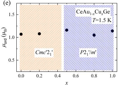 The schematic drawing of the magnetic structures of CeAuGe and CeCuGe is shown in Fig. 4(c) and (d), respectively. The unit cell transformations from parent paramagnetic space groups are given by the following relations A = -b, B = 2a + b, and C = c in \( Cmc^{2}/1' \) and A = a, B = c, and C = -b in \( P2_{1}'/m' \) , where the capital letter and lower case are the basis vectors of the magnetic and the parent paramagnetic space group, respectively. Structure parameters obtained from the fits of neutron diffraction patterns are summarised in Tables S2 and S3. In \( Cmc^{2}2_{1}' \) , the Wyckoff positions for Ce is 4a (0, 0, 0) with magnetic moments allowed only along the crystallographic a-axis. Thus, the magnetic symmetries impose strong constraints on the possible magnetic configurations. On the other hand, the magnetic moments of Ce in Wyckoff position 2a (0, 0, 0) in \( P2_{1}'/m' \) are allowed along the arbitrary direction. The best result of Rietveld refinement, however, was obtained for the moment directed along the a-axis. For both MSGs, the collinear ferromagnetic structure is fixed by symmetry. The refined values of ordered magnetic moments amounted to \( 1.05(2)\mu_{B} \) for CeAuGe and \( 1.11(3)\mu_{B} \) for CeCuGe. They are consistent with the saturated moments in Fig. 3(c) and the previous neutron experiment result of CeAuGe [21]. Fig. 4(e) shows the ordered magnetic moments ( \( \mu_{ord} \) ) as a function of x deduced from the fits of the neutron diffraction patterns (details are given in Table S2 in SM). The samples of \( CeAu_{1-x}Cu_xGe \) with non-centrosymmetric MSG, \( 0 \leq x < 0.5 \) , exhibit the orthorhombic \( Cmc^{2}2_{1}' \) FM structure, while the compositions with centrosymmetric MSG, \( 0.5 \leq x \leq 1 \) .