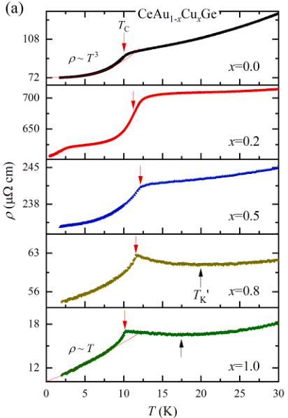 minimum of \( \rho(T) \) at 17.5 K due to the Kondo scattering and T-linear behaviour in the FM state. On the other hand, \( \rho(T) \sim T^{3} \) behaviour in the FM state was observed in CeAuGe without the local minimum of \( \rho(T) \) . Note that the fit by a gap function, \( \rho(T) \sim T^{\alpha}\exp(-\Delta/k_{\mathrm{B}}T) \) , does not work for both cases. Since the temperature exponent of resistivity in CeCuGe and CeAuGe polycrystals are different from the one expected in the ferromagnetic metals [32,33], \( \rho(T) \) measurements on single crystals and at lower temperatures might help to understand the scattering mechanism in the FM state. As shown in Fig. 5(b), the small Cu-doping in CeAuGe suppresses FM transition temperature to 8 K, while other doping cases show \( T_{C} \) higher than x = 0.0 and 1.0. Further experiments with x = 0.2 concentration and other small doping contents can be useful to elucidate the origin of the broad transition at 12.5 K and the low-temperature transition-like feature at 2.5 K that are seen only in the electrical resistivity.