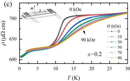 Fig. 5(a) shows the zero-field electrical resistivity as a function of temperature \( (\rho(T)) \) of \( CeAu_{1-x}Cu_{x}Ge \) with showing high resistivity values and metallic behaviour, which are consistent with the previous report [30]. The residual-resistance ratio (RRR) coefficients of \( CeAu_{1-x}Cu_{x}Ge \) are of range from 1.2 to 10.6 (details are given in Table S4 in SM). The first-principles calculations show that \( CeAuGe \) and \( CeCuGe \) both are classified to the semimetal [31]. As shown in the top panel, \( CeAuGe \) (x = 0) exhibits a kink (red downward arrow) which is consistent with the \( T_{C} \) determined by a dip of \( \partial M/\partial T \) . Except for x = 0.2, \( \rho(T) \) in every panel shows the apparent kink at \( T_{C} \) . At temperatures above \( T_{C} \) , a local minimum ( \( T_{K^{*}} \) ) in \( \rho(T) \) is observed in x = 0.8 and 1.0 due to the Kondo effects, suggesting that the Kondo hybridization between \( 4f^{1} \) and conduction electrons becomes stronger near x ~ 1. The local minimum in \( \rho(T) \) is better visually seen in the plot in the overall temperature range, as shown in Fig. S5. Upper panel of Fig. 5(b) shows \( \rho(T) \) and \( M(H) \) of x = 0.2 plotted as a function of temperature on the left and right ordinate, respectively. The transition temperatures of \( \rho(T) \) and \( M(H) \) were determined by the peak of \( \partial M/\partial T \) (black dashed line) and \( \partial \rho/\partial T \) (solid red line) for x = 0.2 and separated by \( \sim 2 \) K due to the broadened FM phase transition. In addition, the resistivity \( \rho(T) \) exhibits a broad hump in the ferromagnetic state around 2.5 K. The lower panel of Fig. 5(b) shows neutron integrated intensity (int. I) for x = 0.2 as a function of temperature obtained from the Gaussian fits of two most intense magnetic peaks (200) and (001). The FM contribution appears below 8 K, consistent with the magnetization \( \partial M/\partial T \) . As shown in Fig. 5(c), on the other hand, resistivity exhibits a drop near 12.5 K then moderately decreases from \( \sim 8 \) K, where the bulk \( T_{C} \) is observed. With further lowering the temperature, the transition-like broad hump is observed below 2.5 K, and it decreases down to 0.28 K. When subjected to the magnetic field applied along the out-of-plane direction, the onset temperature of the resistivity drop at 12.5 K is increased and broadened as the field increases, while the transition-like feature around 2.5 K stays robust up to 50 kOe.