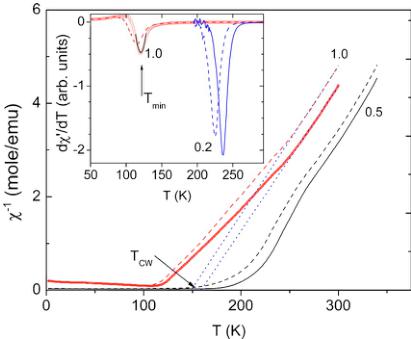 FIG. 2. (Color online) \( \chi^{\prime-1} \) as a function of temperature for the Pr content y indicated in the plots. The dotted lines show the fits of high temperature part of \( \chi^{\prime} \) to the Curie-Weiss low. The refined Curie temperatures \( T_{CW} \) are indicated. The inset shows two examples of the first derivative \( d\chi^{\prime}/dT \) as a function of temperature. \( ^{16} \) O and \( {}^{18} \) O samples are shown by solid and dashed lines, respectively, except for the y=1.0 ( \( {}^{16} \) O) sample, which is shown by circles. The solid line in the inset for this sample shows example of the parabolic fit. The refined temperature of the minimum is indicated in the inset.