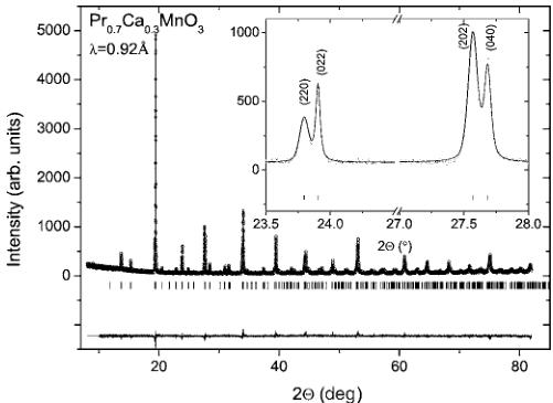 FIG. 3. An example of the Rietveld refinement pattern and difference plot of x-ray synchrotron diffraction data (MSP/SLS, PSL, \( \lambda=0.92\ \AA \) ) for the sample with \( \gamma=1.0 \) at room temperature. The inset illustrates anisotropic line broadening along the a axis.