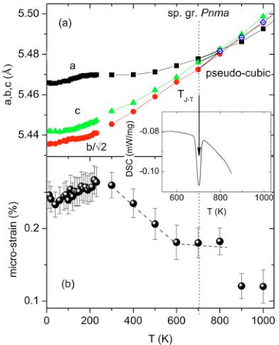 FIG. 7. (Color online) (a) Lattice constants and (b) isotropic microstrains as a function of temperature in the \( (\mathrm{La}_{1-y}\mathrm{Pr}_{y})_{0.7}Ca_{0.3}MnO_{3} \) (y=0.75). The inset shows the differential scanning calorimetry signal with the same x axis. The minimum indicates the presence of the latent heat of the first order phase transition at the temperature \( T_{J-T} \) .