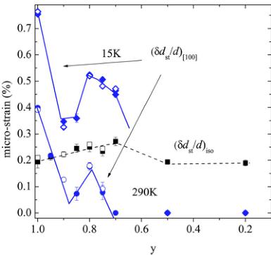 the LPCM is larger apparently due to the larger \( Mn^{3+} \) fraction. An evident indicator of the charge ordering is the mismatch of the short Mn-O22 and Mn-O1 bond lengths. In the antiferrodistorsive OO state all the \( z^{2} \) orbitals are in the ac plane, while below the CO transition the \( z^{2} \) orbitals located at "Mn \( ^{4+} \) " sites should be oriented perpendicular to the (ac) plane to stabilize the ferromagnetic coupling between the neighboring planes along b axis of the PCE-type antiferromagnetic structure. This is reflected as a decrease in the short Mn-O22 with respect to the Mn-O1 bond below \( \sim250 \) K (Fig. 8). Figure 9 shows the temperature dependences of the bond lengths as a function of Pr-concentration y. One can see that the difference of the Mn-O1 and Mn-O22 bond lengths is drastically decreased near y=0.9, reflecting the suppression of the charge ordering. In the metallic predominantly ferromagnetic state (y \( \leq \) 0.5) CO is suppressed as well. Another parameter which can be considered as a structure indicator of the CO state is the anisotropic microstrain \( (\delta d_{\mathrm{st}}/d)_{[100]} \) along a axis, along which the doubling of the unit cell occurs in the CO phase. This implies that the CO/OO is not perfectly homogeneous as in purely “50:50” composition \( La_{0.5}Ca_{0.5}MnO_{3} \) but there is a distribution of domains with different extent of CO thus leading to the dispersion of the lattice constant a. The anisotropic microstrain is pronouncedly increased on cooling for \( y\geq0.7 \) , but has a nonzero value at room temperature 290 K as shown in Fig. 10. A remarkable feature of \( (\delta d_{\mathrm{st}}/d)_{[100]} \) is a local minimum around \( y_{c}=0.9 \) pointing to a suppression of the CO concomitantly with the suppression of the AFM and FM ordering as discussed below. The isotropic microstrain value \( (\delta d_{\mathrm{st}}/d)_{\mathrm{iso}} \) (also shown in Fig. 10) does not exhibit any peculiarity at \( y_{c} \) ruling out any kind of sample effect.