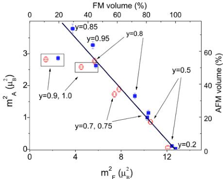 FIG. 13. (Color online) Effective antiferromagnetic \( m_{A}^{2} \) as a function of the effective ferromagnetic moment \( m_{F}^{2} \) for all the samples with y as a parameter indicated for each point. The top-x and right-y axes show respective phase fractions. The line is a linear fit, y=0.9 and y=1.0 ( \( ^{18}O \) ) are excluded from the fit. The closed and open symbols represent the \( {}^{16}O \) and \( {}^{18}O \) samples, respectively.