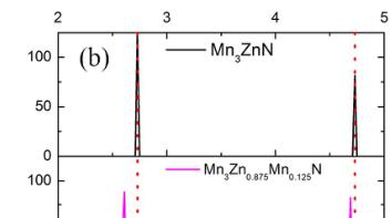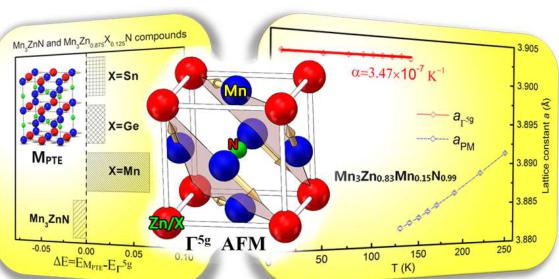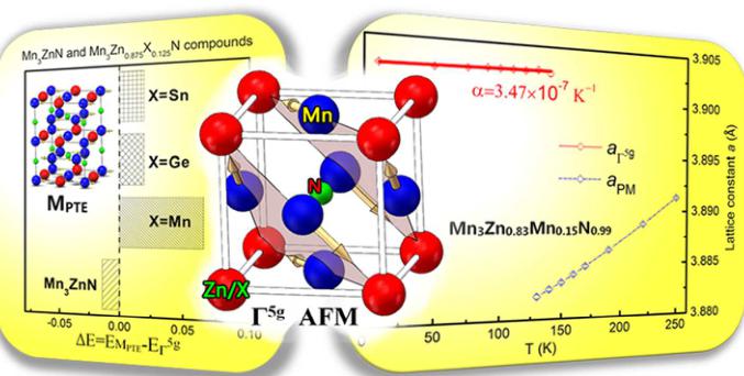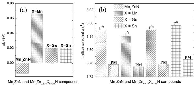 energy difference \( \Delta E \) between \( EM_{PTE} \) and \( E_{1.5^{g}} \) for \( Mn_{3}ZnN \) and \( Mn_{3}Zn_{0.875}X_{0.125}N \) (X=Mn, Ge, and Sn) using PW91 EC functional. Negative \( \Delta E \) indicates that the \( M_{PTE} \) AFM phase is favorable; otherwise \( \Gamma^{5g} \) AFM structure should be stable. It can be seen that the \( \Delta E \) values change from negative to positive with X doping at Zn sites, corresponding to -0.014, 0.066, 0.02, and 0.02 eV for \( Mn_{3}ZnN \) , \( Mn_{3}Zn_{0.875}Mn_{0.125}N \) , \( Mn_{3}Zn_{0.875}Ge_{0.125}N \) , and \( Mn_{3}Zn_{0.875}Sn_{0.125}N \) , respectively. This suggests that X doping could stabilize the special \( \Gamma^{5g} \) AFM phase as the ground state in \( Mn_{3}Zn_{0.875}X_{0.125}N \) . Moreover, as shown in Figure 3(b), the equilibrium lattice constants of \( \Gamma^{5g} \) AFM phase are 3.861 Å and 3.874 Å for Ge doped and Sn doped compounds, respectively, which are comparable to the experimental values of 3.909 Å for \( Mn_{3}Zn_{0.9}Ge_{0.1}N \) at 202 K \( ^{32} \) and 3.930 Å for \( Mn_{3}Zn_{0.8}Sn_{0.2}N \) at 265 K \( ^{33} \) . The calculated lattice constants of the PM phase become 3.758 Å for \( Mn_{3}Zn_{0.875}Ge_{0.125}N\) and 3.772 Å for \( Mn_{3}Zn_{0.875}Sn_{0.125}N\) , signifying that the lattice contraction ( \( \Delta a/a \) ) 0.027 for Ge doping and 0.026 for Sn doping could be observed with magnetic transition from \( \Gamma^{5g} \) AFM to PM phase. These characteristics qualitatively agree with the experimental results, e.g., antiperovskite compounds \( Mn_{3}Zn_{1-x}X_{x}N \) with X (X = Ge and Sn) doping have been found to contain \( \Gamma^{5g} \) AFM ground state and exhibit NTE (ZTE) behavior that caused by MVE effect. \( ^{27, 32, 33} \) This suggests that we could make a prediction on the antiperovskite compounds with \( \Gamma^{5g} \) AFM ground state using PW91 EC functional. On the other hand, for Mn doped \( Mn_{3}Zn_{0.875}Mn_{0.125}N\) , the \( \Gamma^{5g} \) AFM ground state and MVE effect are also predicted, which will be discussed in the following experimental section.