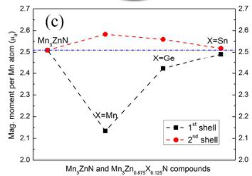 Figure 4. (a) Crystal structure showing the first \( (1^{\mathrm{st}}) \) and second \( (2^{\mathrm{nd}}) \) nearest shells (Zn/X-Mn) around X atom for \( Mn_{3}ZnN \) and \( Mn_{3}Zn_{0.875}X_{0.125}N \) (X= Mn, Ge, and Sn). (b) Corresponding radial distribution function and (c) magnetic moment per Mn atom for \( 1^{st} \) and \( 2^{nd} \) shells.