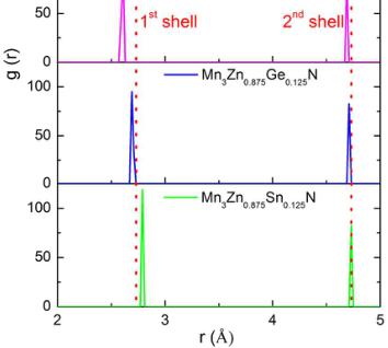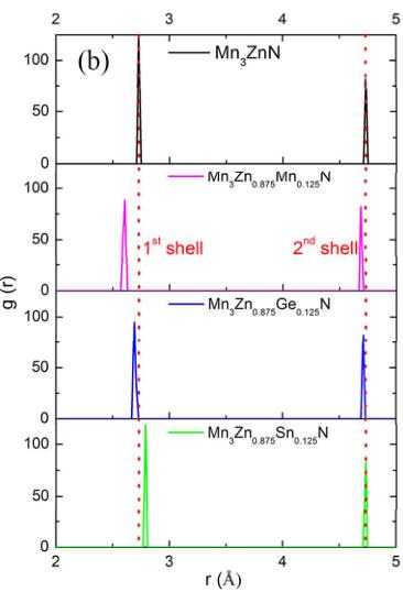 where \( N_{n}(r) \) and \( V_{n} \) are the mean numbers and mean volume of atoms between r to \( r+dr \) around an atom, N is the numbers of atoms. \( ^{44} \) For \( Mn_{40}Zn_{7}XN_{8} \) , after optimizing the structure using VASP code, the RDF (Zn/X-Mn around X) is calculated by the VMD software. \( ^{45} \)