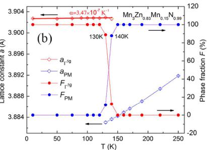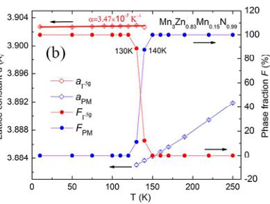 In order to verify the prediction that Mn doping at Zn site could induce the \( \Gamma^{5g} \) AFM ground state, the sample with refined compositions of \( Mn_{3}Zn_{0.83}Mn_{0.15}N0.99 \) was synthesized and analyzed by NPD method. Figure 5(a) shows the NPD pattern of \( Mn_{3}Zn_{0.83}Mn_{0.15}Ni_{0.99} \) at 10 K. The NPD pattern could be fitted well with a structural model of cubic symmetry and the \( \Gamma^{5g} \) AFM model, as shown in Figure 1(a). For \( Mn_{3}ZnN \) , it has been investigated previously, with a \( M_{PTE} \) magnetic ground state and a combination of \( \Gamma^{5g} \) and \( M_{PTE} \) AFM phases between 140 K and 177 K. Noticeably, our NPD study indicates that the ground state phase becomes \( \Gamma^{5g} \) symmetry in \( Mn_{3}Zn_{0.83}Mn_{0.15}N^{0.99} \) , suggesting that we could stabilize the \( \Gamma^{5g} \) AFM phase by Mn doping at Zn site. Moreover, the refined lattice constant a and AFM moment of Mn are 3.90274 Å and 2.60 \( \mu_{B}/Mn \) , respectively, in \( Mn_{3}Zn_{0.83}Mn_{0.15}Ni^{0.99} \) , which are less than the values 3.912 Å and 2.61 \( \mu_{B}/Mn \) in \( Mn_{3}Zn_{0.99}N^{0.27} \) . This is in qualitative agreement with the calculated results that Mn doping could induce the decreasing of a and \( m_{Mn} \) in \( Mn_{3}Zn_{0.875}Mn_{0.125}N \) . On the other hand, the evolution of lattice constant and phase fractions with temperature is taken into consideration, as shown in Figure 5(b). Table S1 gives more details for the refined structural parameters of \( Mn_{3}Zn_{0.83}Mn_{0.15}M^{0.99} \) compound at some representative temperature. For the phase fractions, the transition from \( \Gamma^{5g} \) AFM to PM is incomplete, and the \( \Gamma^{5g} \) phase fraction decreases gradually upon further heating and coexists with the PM phase between 130