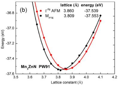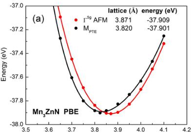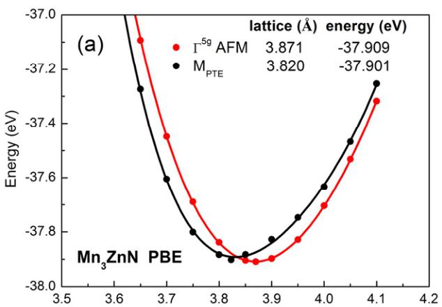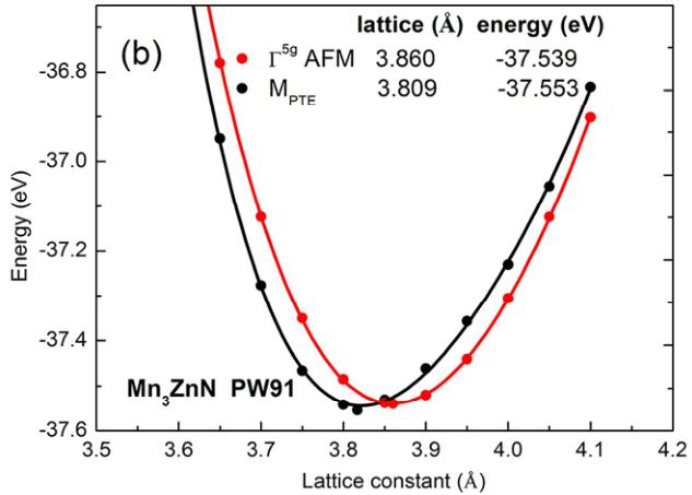 Figure 2(a), the total energy of the \( \Gamma^{5g} \) magnetic structure is 0.008 eV/f.u. (f.u. is the abbreviation of formula unit) lower than that of the \( M_{PTE} \) state at their optimal lattices using PBE, which is qualitatively in agreement with the previously calculated results. \( ^{47} \) This indicates that magnetic ground state is \( \Gamma^{5g} \) AFM structure in the case of PBE EC functional. However, instead of \( \Gamma^{5g} \) AFM phase, the \( M_{PTE} \) ground state should be observed because this phase was confirmed below 140 K from NPD result. \( ^{27,48} \) Importantly, as shown in Figure 2(b), the \( M_{PTE} \) ground state is obtained in the case of PW91, indicating the PW91 EC functional should be selected for the simulation of \( Mn_{3}ZnN \) .