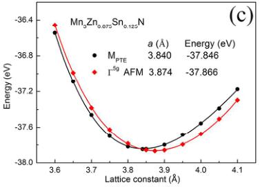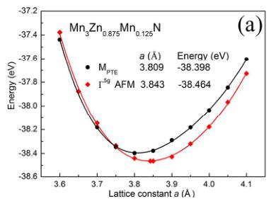 Based on the calculated results by PW91 EC functional, the total energy of the \( M_{PTE} \) 0.014 eV/f.u. is lower than that of \( \Gamma^{5g} \) AFM state at their optimal lattices. Generally, phase separation behavior can be resulted from the thermodynamic competition between phases with nearly identical free energies. \( ^{48, 49} \) For \( Mn_{3}ZnN \) ,