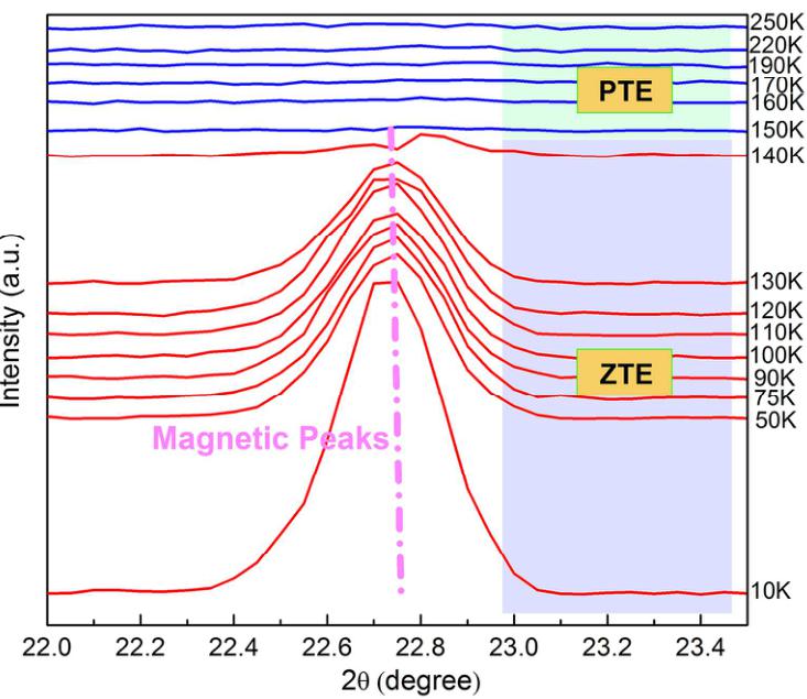 and 140 K. Figure S3 provides supplementary details about the evolution of the NPD pattern with temperature. In addition, the MVE effect with magnetic transition from \( \Gamma^{5g} \) AFM (large volume) to PM (small volume) phases is observed as the previously calculated prediction. More importantly, the ZTE behavior is observed below 140 K within \( \Gamma^{5g} \) AFM phase, corresponding to the coefficient of linear thermal expansion \( \alpha_{l} = 3.47 \times 10^{-7} \) K \( ^{-1} \) . This demonstrates that the ZTE behavior can be obtained by achieving the \( \Gamma^{5g} \) AFM phase in antiperovskite compounds. \( ^{26,27} \)