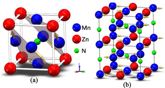 Figure 1. Crystal and magnetic phases of \( Mn_{3}ZnN \) for (a) antiperovskite crystal structure and noncollinear \( I^{5g} \) AFM and (b) collinear AFM structures.