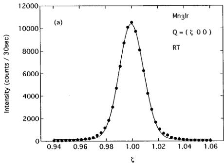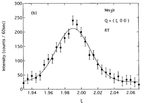 Figure 1 shows the longitudinal (100) and (111) scans in \( Mn_{3}Ir \) at room temperature. Solid lines in Fig. 1 are Gaussian fits to the peak profiles. The ratio of (111)- to (100)-reflection integrated intensities, \( I_{111}/I_{100} \) , is evaluated as \( 9.2 \times 10^{-3} \) . The full width at half maximum (FWHM) of the