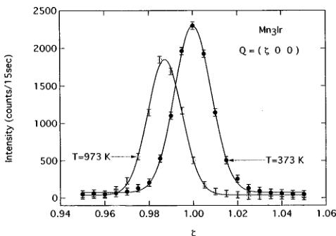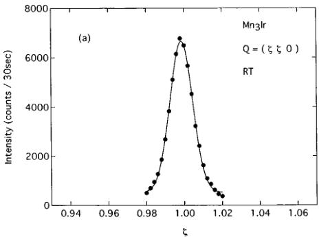 A mixture containing 25 at.% Ir was melted, turned, and remelted in an alumina crucible in an Ar atmosphere. The single crystal was grown from the ingot by the Bridgeman method, annealed at 1000 K for three weeks in an evacuated quartz tube, and then cooled to room temperature in a furnace. Neutron-diffraction experiments were performed using a conventional-type triple-axis spectrometer \( T_{1-1} \) installed at a thermal guide of JRR-3M, Tokai. The neutron wavelength was \( \lambda=2.437 \) Å. Bragg reflection intensities for \( Mn_{3}Ir \) were subject to a neutron pass in the sample, due to the large absorption of the neutron beam by the Ir nuclei. To diminish the absorption effect, we shaped the sample into a disk 8 mm in diameter and 2 mm thick. The sample in the furnace was placed with the [110] crystal axis perpendicular to the scattering plane. Neutron-diffraction measurements showed that the annealed sample had the \( Cu_{3}Au \) -type crystal structure. Absence of a diffuse peak around (001) supports that the ordered sample is almost free from the disordered phase.
