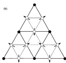 FIG. 3. (a) Antiferromagnetic structure and (b) the corresponding (111) surface spin structure for \( Mn_{3}Ir \) . Open and solid circles represent Mn and Ir atoms, respectively.