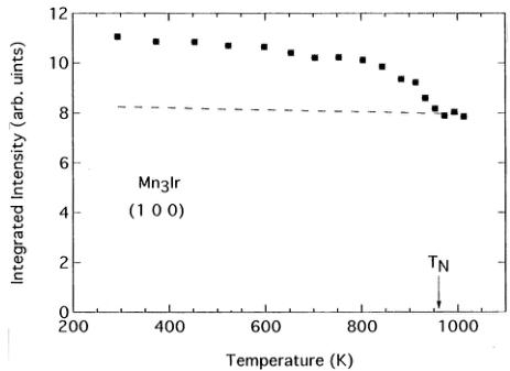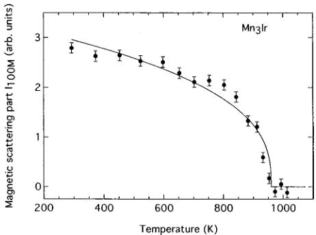 We measured the temperature dependence of the (100) Bragg reflection. Typical data are shown in Fig. 4. Figure 5 plots the integrated intensity of the (100) reflections. The AF phase transition for the ordered alloy occurs at \( T_{N}=960\pm10 \) K, in good agreement with the value determined by susceptibility measurements. \( ^{4} \) The Néel temperature \( T_{N} \) for the corresponding disordered phase is 780 K. \( ^{4} \) The dashed line in Fig. 5 is the calculated temperature dependence of the nuclear-scattering part of the (100) reflection due to Debye–Waller factor, \( ^{10} \) using the Debye temperature \( \Theta=300 \) K for \( Mn_{3}Ir \) . \( ^{11} \) The subtraction of the nuclear-scattering part gives the magnetic part of the integrated intensity of the (100) reflection, \( I_{100M} \) , depicted in Fig. 6. The solid line in Fig. 6 is a least-squares fit to the data with the power law function, \( I_{100M}\propto(1-T/T_{N})^{2\beta} \) using \( \beta=0.17\pm0.01 \) . On the other hand, the intensity of the (110) magnetic reflection for the disordered \( Mn_{0.83}Ir_{0.17} \) alloy, \( I_{110} \) , is found to obey the relationship \( I_{110}\propto(1-T/T_{N})^{2\beta} \) with \( T_{N} \) .