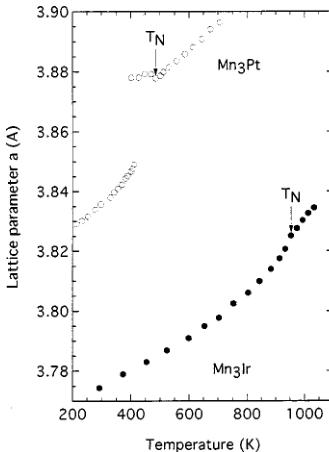 On heating to \( T_{N} \) , the lattice parameter a in \( Mn_{3}Ir \) deviates upwards from a linear temperature behavior. The lattice parameter a in the low-temperature AF phase of \( Mn_{3}Pt \) also has the nonlinear temperature dependence. In contrast, the lattice parameters a in the paramagnetic phase of these alloys increase linearly with increasing temperature. The \( Mn_{3}Ir \) result shows that the AF phase transition gives rise to the lattice contraction just below \( T_{N} \) . The x-ray diffraction study on the ordered \( Mn_{3}Pt \) indicates no deviation from cubic symmetry in the low-temperature AF phase. \( ^{13} \) This suggests that the lattice contraction in \( Mn_{3}Ir \) is isotropic.