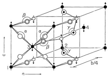 From (3) we have \( I_{1x}=4S_{1x} \) and \( I_{1y}=I_{1z}=0 \) so that the approximate spin direction is along the a-axis. From (2) \( m_{1x}=m_{1y}=0 \) , \( m_{1z}=4S_{1z} \) and a small moment appears in the c-direction.