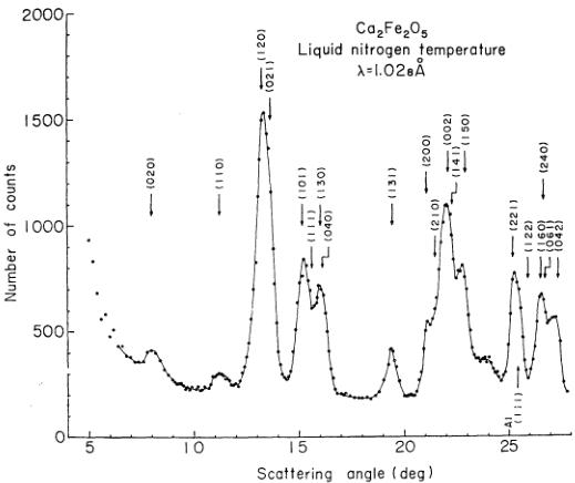 Powdered samples were sintered from constituent compounds, \( CaCO_{3} \) and \( Fe_{2}O_{3} \) , at about \( 1200^{\circ}C \) in air for 3 hrs, and then annealed at \( 1150^{\circ}C \) for 3 hrs. Small amounts of ferromagnetic impurities, if any, were removed by this annealing process. X-ray diffraction pattern was taken, and it was found that both line positions and line intensities were in complete conformity with Bertaut et al.'s. \( ^{1,2} \) Neutron diffraction patterns were taken with TOG neutron diffractometer installed at JRR-3 of JAERI. The pattern taken at liquid nitrogen temperature is shown in Fig. 2. All the existing lines could be indexed on the basis of the chemical unit cell, except for some amount of contamination with Al, mainly from the aluminum sample holder. Observed magnetic intensity was deduced from the difference pattern between the liquid nitrogen temperature run and