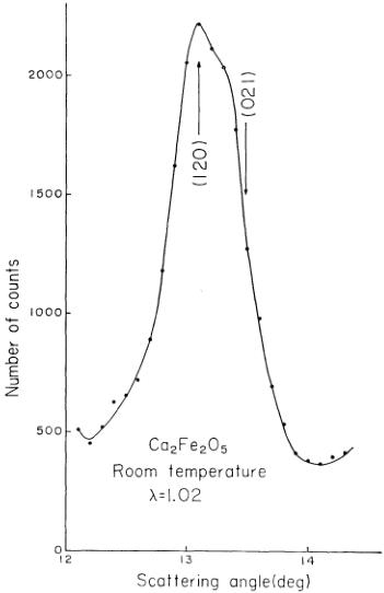 The spin direction is more difficult to determine. In Table II we have shown the result of calculation similar to that given in Table I, but the spin direction is assumed to be along a or b axis. Spin//a is more consistent with experiment than spin//b, since in the latter case the calculated intensity for the peak including (221) line is too strong, while that including (160) is too small. Then we have to compare spin//a with spin//c. The compatibilities of these two models with experiment are about the same. So we decided to measure the shape of the (120)+(021) peak carefully, in order to choose a better one out of them. As can be seen from the tables, (120) intensity is bigger than (021) intensity for spin//c, and the situation is reversed for spin//a. The measurement was done at room temperature with the sample in a cassette with a smaller diameter (15 mm) and with a higher counting statistics. This was meant to increase the resolution. Actually we could obtain an asymmetrical shape of the peak as shown in Fig. 3. The data show that spin//c is more favorable.