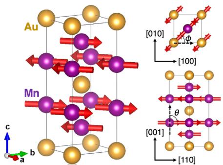 \( Mn_{2}Au \) is one of few room-temperature metallic antiferromagnets, along with CuMnAs and \( Cr_{2}Al \) , that have the crystal symmetry and collinear antiferromagnetic order that allows a staggered (Néel) accumulation of spins in the antiferromagnetic (AFM) sublattices [16,17], which in principle allows the electronic manipulation of the Néel vector using Néel spin-orbit torques [5,15]. \( Mn_{2}Au \) has shown domain orientation by current-induced Néel vector switching [18], though the applied currents are large and the resistance can display a cumulative, sawtooth-shaped pattern rather than binary switching [16]. The unit cell of \( Mn_{2}Au \) is shown in Fig. 1 with arrows on Mn atoms to show this magnetic ordering. Neutron diffraction and magnetization studies on powder \( Mn_{2}Au \) by Barthem et al. confirm the \( k \equiv 0 \) antiferromagnetic structure of \( Mn_{2}Au \) with spins in the ab plane [20]. However, zero-field neutron diffraction of a tetragonal compound does not permit unique identification of the easy axis within the ab plane. The powder study also showed an approximate susceptibility of \( 5 \times 10^{-4} \) averaged over all crystal directions. Neutron data showed a Mn moment of about \( 4\mu_{B} \) , which is retained to about 85% of its base value at 900 K [20]. \( Mn_{2}Au \) thus maintains its magnetic ordering until it decomposes upon heating into MnAu and an fcc solid solution phase, with a Néel temperature theorized up to 1300–1600 K [20,21]. The presence of gold in \( Mn_{2}Au \) should also lead to a significant contribution from spin-orbit coupling [22]. This high thermal stability is a hallmark of strong exchange interactions and anisotropy, and makes the material ideal for fundamental studies at room temperature or future data storage applications [16], but no bulk crystal growth has been reported to date.