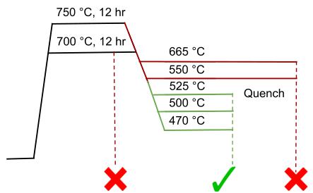 FIG. 2. Quenching experiments performed at a range of temperatures are summarized along with the respective phases formed. MnAu formation is represented by the red ×, and \( Mn_{2}Au \) formation is represented by the green check.