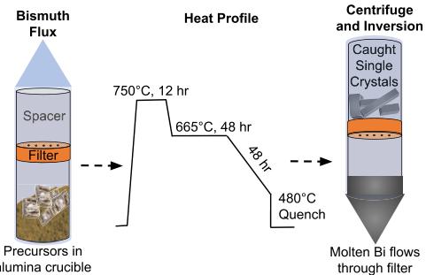 Synthesis was performed using solid-state methods and metal flux techniques. As-received Mn pieces with oxidetarnished surfaces were cleaned by heating in vacuum at \( 1000^{\circ} \) C for 12 hours, after which the Mn pieces are bright silver and the inner walls of the tube are dark. Flux growth of \( Mn_{2}Au \) crystals was conducted using elemental precursors of Mn granules (99.98%, 0.8–12 mm), Au powder (99.99%, 100 mesh), and Bi chunks (99.99%, \( \leqslant \) 15 mm) with an optimized nominal molar ratio of \( Mn:Au:Bi = 7:1:12 \) . The precursors were loaded into alumina crucibles, topped by alumina fritted disks [27] and a glass rod spacer in a fused silica ampoule. This setup, prepared in an argon-filled glovebox, was then evacuated and sealed at about 50 mTorr of pressure for reaction in an inert environment. The precursors were heated to a maximum temperature of \( 750^{\circ} \) C for 12 hours, quickly cooled and held at \( 650^{\circ} \) C for up to 24 hours below the dissociation temperature of \( Mn_{2}Au \) , slowly cooled to \( 470–480^{\circ} \) C for crystal growth, and from this temperature inverted and centrifuged to remove excess flux. Variations of this recipe used to determine the precipitation temperature of the \( Mn_{2}Au \) phase and to optimize relative nominal amounts of precursors are summarized in Fig. 2 and tabulated in the Supplemental Material, Table S1 [28], along with a list of the largest crystal sizes obtained from each reaction. The synthesis is shown schematically in Fig. 3. \( Mn_{2}Au \) single crystals were manually isolated from remnant Bi flux by mechanically scraping or cleaving samples to isolate clean parts. Where remnant flux could not be easily removed mechanically, samples were acid etched with a 2:1 ratio of \( HNO_{3} \) and HCl for less than 2 min.