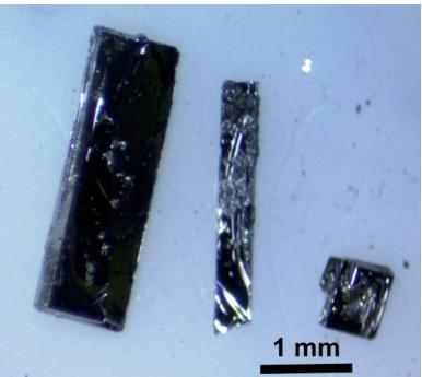 In order to find optimal heating and composition protocols, many samples were prepared under varying conditions such as the nominal amounts of Mn:Bi and the heating profile. A variety of crystal shapes were obtained, as shown in Fig. 4, including cubes, thick needles, and flat plates on the millimeter scale. There may be some significance of specific heating steps that were attempted: As an example, a hold at \( 650^{\circ} \) C seems to favor a smaller quantity of larger single crystals, and larger Mn:Bi ratios favor platelike morphology over thin needles. However, a mechanistic understanding of these steps remains to be fully developed due to the complexity of the process. Variations of flux syntheses are tabulated in the Supplemental Material [28]. The largest crystals at optimized conditions were used for further characterization.